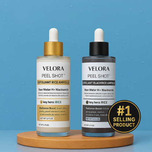 Velora Peel Shot™ combines Ion Water H+, Niacinamide, and Rice Extract to deeply unclog pores, dissolve blackheads, and smooth uneven texture, revealing instantly clearer, refined skin.